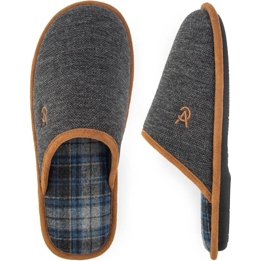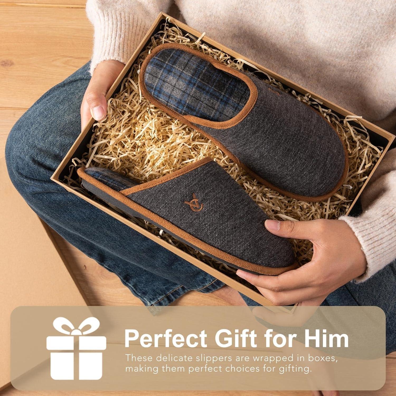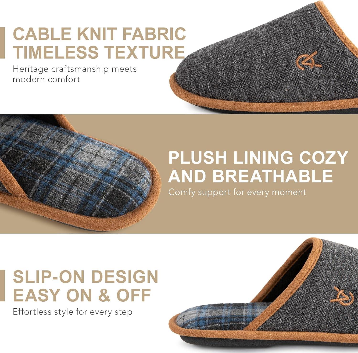 VeraCosy Men’s Knitted Scottish Slippers with Soft Memory Foam Non Slip Indoor Rubber Sole(Dark Black)